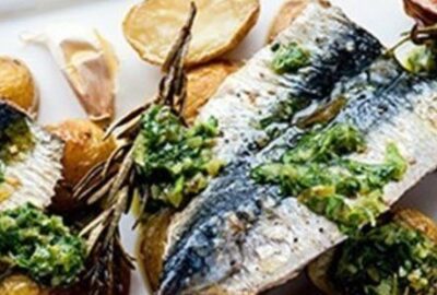 Grilled sardines with garlic roasted Jersey Royals, salsa verde