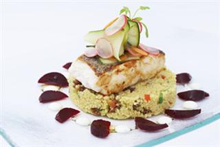 Pan-fried hake with cous cous and pickled vegetables
