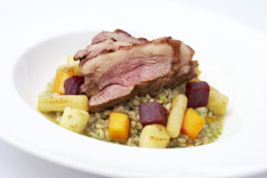 Roast Loin of Lamb with a Barley and Pot Roasted Vegetable Broth