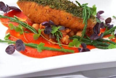 Baked Salmon with a Herb Crust and Red Pepper Coulis