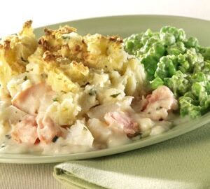 Fish Pie with Herby Mash and Rustic Pea Puree